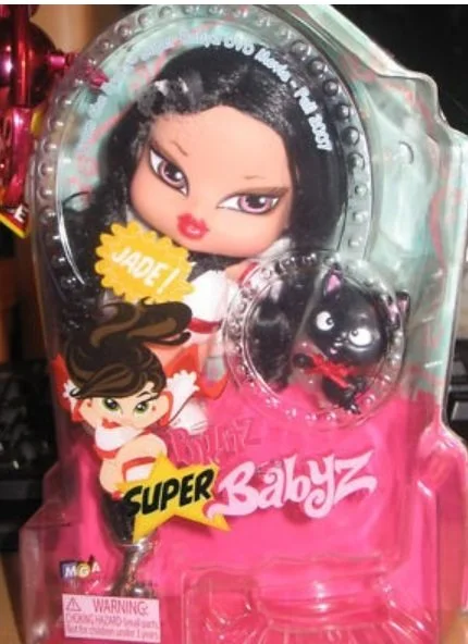 Jade is one of the core characters of the Bratz brand and has appeared in a majority of the main brand’s collections, as well as a majority of the brand’s spinoffs. Since her introduction in 2001, Jade has appeared in the Lil’ Bratz, Bratz Babyz, Itsy Bitsy Bratz, Bratz Kidz, Bratz Lil’ Angelz, and Mini Bratz lines as a core character. Due to the 2008 ruling in the Mattel v. MGA Entertainment lawsuit, Jade was featured less in the Bratz lineup as her name, being the only name to sustain from the original pre-production Bratz concept, was technically copyrighted. Notably, Mattel’s cancelled version of Bratz featured a Jade doll wearing a blouse covered in a monogram “Jade” name print likely as a way to mock their competitor.