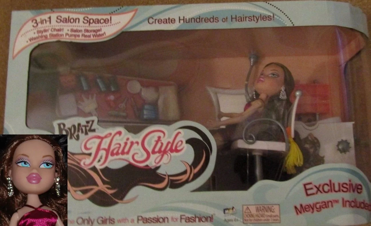 Meygan made her first appearance as part of the first edition of the Bratz XPress It! collection in 2002. Meygan was the first Bratz character introduced after the core four and was originally discontinued in 2003; however, she was reintroduced in 2004 as part of the Bratz Wild Life Safari collection. Since her introduction, Meygan has become a staple secondary character in the Bratz brand, and has made appearances in the Lil’ Bratz, Bratz Babyz, Itsy Bitsy Bratz, Bratz Kidz, 4-Ever Kidz, Bratz Lil’ Angelz, and 4-Ever Lil’ Angelz lines.